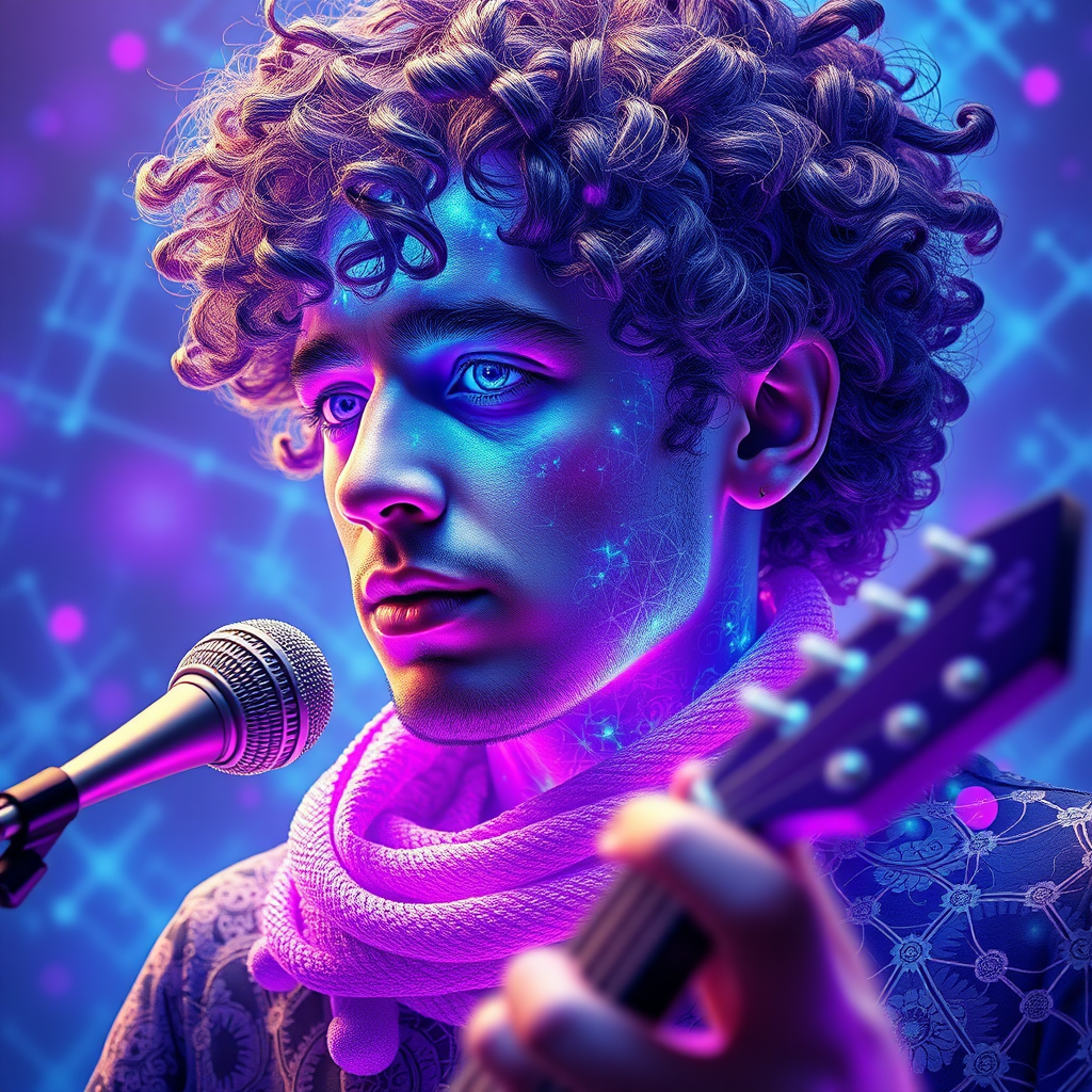 A curly-haired musician captured in the style of Beeple, emanating a vibrant, luminous true blue light, depicted with hyper-realistic detail; features intricate patterns and sculptural elements intertwined with bright gray and electric purple hues, forming complex networks and delicate layers, set against a harmonious backdrop of ethereal, pulsating energy.