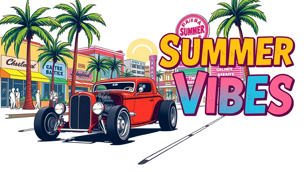 A custom illustration of a vintage hot rod driving down a sunny street adorned with palm trees. The retro cityscape in the background features colorful buildings, a lively neon sign, and a busy crowd. The text "Summer Vibes" is presented in a retro, distressed style with each letter in a unique color, invoking a sense of nostalgia. This design, ideal for a t-shirt, stands out against a clean white background. The scene captures a sense of vibrant, carefree energy and nostalgia.