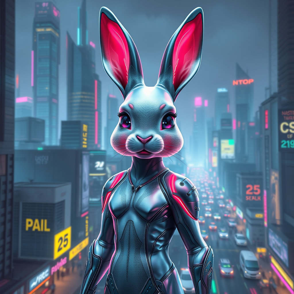 A cute cyberpunk dark future pinup poster featuring a stunningly attractive 25-year-old humanoid rabbit with sleek, metallic fur and glowing neon accents. The rabbit stands confidently against a dystopian cityscape, where towering skyscrapers and bustling streets are bathed in the glow of colorful holograms. The landscape is beautifully detailed, with perfectly balanced studio lighting highlighting the busy, multi-layered environment. The rabbit's eyes shine with intelligence and daring, embodying the essence of a masterwork in a world where technology and nature blend seamlessly.