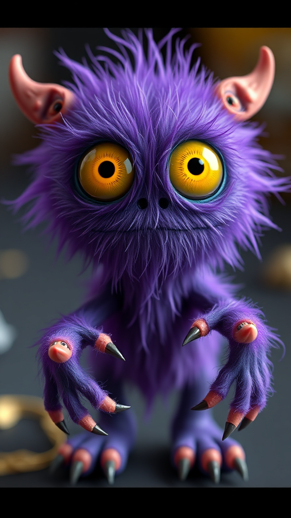 A cute, small, purple, furry monster with vibrant yellow eyes. Intricate 3D image captured using Unreal Engine, trending on ArtStation. Features realistic fur and a distinct fish-eye art style, with big reflective eyes reminiscent of Pixar animation. Embodies cinematic smoothness from Unreal Engine, showcasing intricate details with two heads and faces. The image is cropped, leaving parts out of frame, with deformed and twisted fingers and a long neck. Exhibits unique characteristics like malformed, duplicated limbs and unusual hand structures, creating a surreal effect. The monster has an elongated body with disfigured, distorted, abstract elements. Cartoon-like yet highly detailed, the artwork appears toy-like in a 3D setting. Features disjointed limbs and strange color schemes, with aspects of the image appearing blurry or low-res, culminating in a bizarre, imaginative creation.