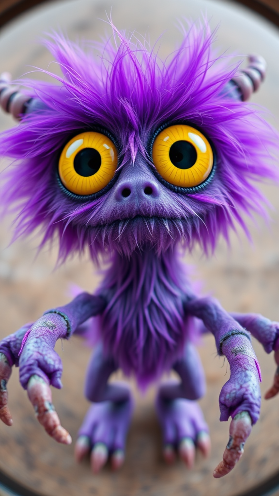 A cute, small, purple, furry monster with yellow eyes, featuring a 3D look inspired by Pixar and Unreal Engine cinematics. The creature has realistic, detailed fur, and possesses two heads with charming big, circular reflective eyes. Its whimsical features are complemented by a long neck and an intricate body displaying twisted fingers and multiple limbs. The image appears in fish-eye art style, with a cropped frame that adds to the surreal, abstract essence. The monster's intriguing appearance includes deformed hands, extra fingers, and some disfigured, mutated aspects giving it a cartoonish, toy-like feel. Its form is playful yet slightly unsettling, with proportions that are amusingly morbid but endearing, featuring weird colors and abstract traits that echo a sense of chaos and creativity.