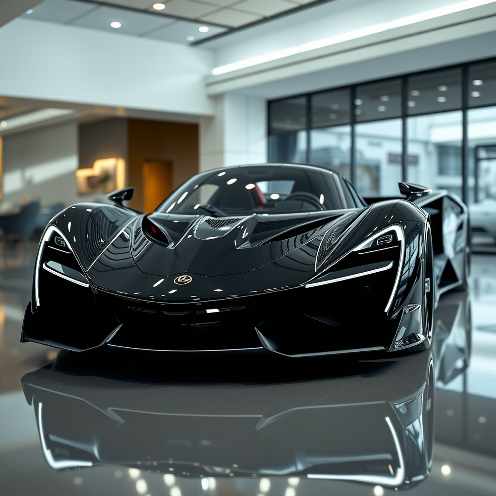 A cutting-edge 2023 supercar with a sleek black body and striking silver accents, showcased from the front view in an elegant showroom. The setting highlights the car's design under bright showroom lights, rendered with Unreal Engine 5 to achieve breathtaking photorealism. The scene boasts ultra-high-definition resolution in 8k and 16k, with exceptional detail in 4k and HD. Advanced Unreal Engine 4k technology is employed, featuring ray tracing for lifelike reflections and a hyper-realistic quality. This supercar exudes sophistication and power, captured flawlessly in 1080p, with subtle enhancements that accentuate its futuristic elegance.