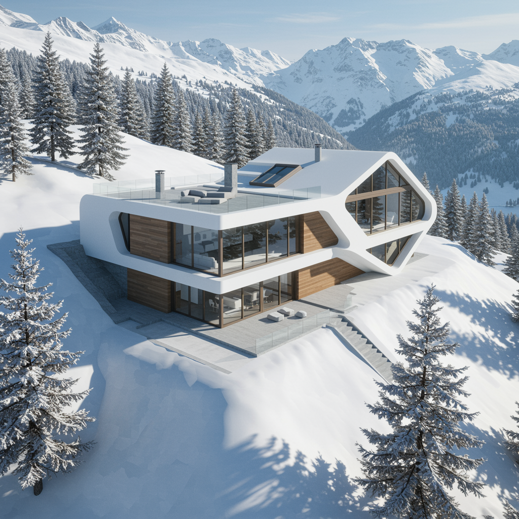 A cutting-edge luxury Swiss home perched atop a mountain, showcasing sleek white walls and expansive triangular windows. The design is characterized by graceful curves and a futuristic flair, nestled amidst a snowy landscape dotted with pine trees. The house features a harmonious blend of wood and concrete with an emphasis on large glass panels and minimalist aesthetics. Vast open-plan living areas seamlessly integrate with the natural surroundings, complemented by glass walls that promote transparency and light. A rooftop deck offers breathtaking panoramic views of the mountain vista. Channeling the visionary styles of Bjarke Ingels, Zaha Hadid, and Frank Gehry, the home boasts clean lines and an intricately detailed design, creating a sharp and captivating focus.