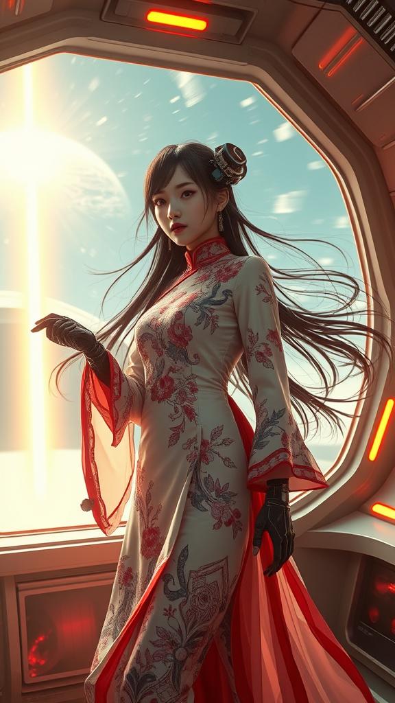 A cyber-enhanced girl with advanced cyberpunk prosthetics, draped in a traditional yet futuristic Chinese dress, her long hair flowing as she stands inside a sleek, cutting-edge spaceship. The environment is futuristic and richly detailed, with a central laser beam that pierces through the sky, surrounded by swirling energy clots. The scene is rendered in photorealistic and hyper-realistic style, capturing the essence of acceleration and rapid motion, illuminated by bright flashes of light. This cinematic masterpiece is painted with an 8K ultra-high-definition resolution, showcasing super-resolution detail in a long-exposure format.
