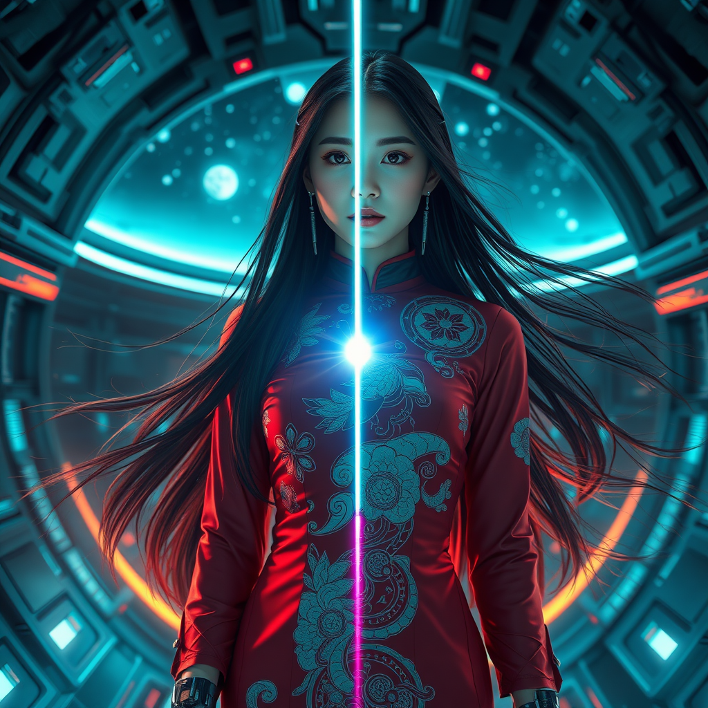 A cyber-enhanced girl with sleek cyberpunk prosthetics, wearing a traditional Chinese dress, her long hair flowing with grace. Inside a futuristic spaceship, she stands amidst a hyper-detailed sci-fi setting. A brilliant laser pierces through the center of the scene, extending from the cosmos above, surrounded by swirling energy clots. The image captures photorealistic and hyper-realistic elements, emphasizing acceleration and bursts of light in motion. An artistic masterpiece in cinematic scope, with echoes of speed and painting dynamics, rendered in super high definition and resolution, showcasing long exposure to depict laser vibrance and energy intricacies.