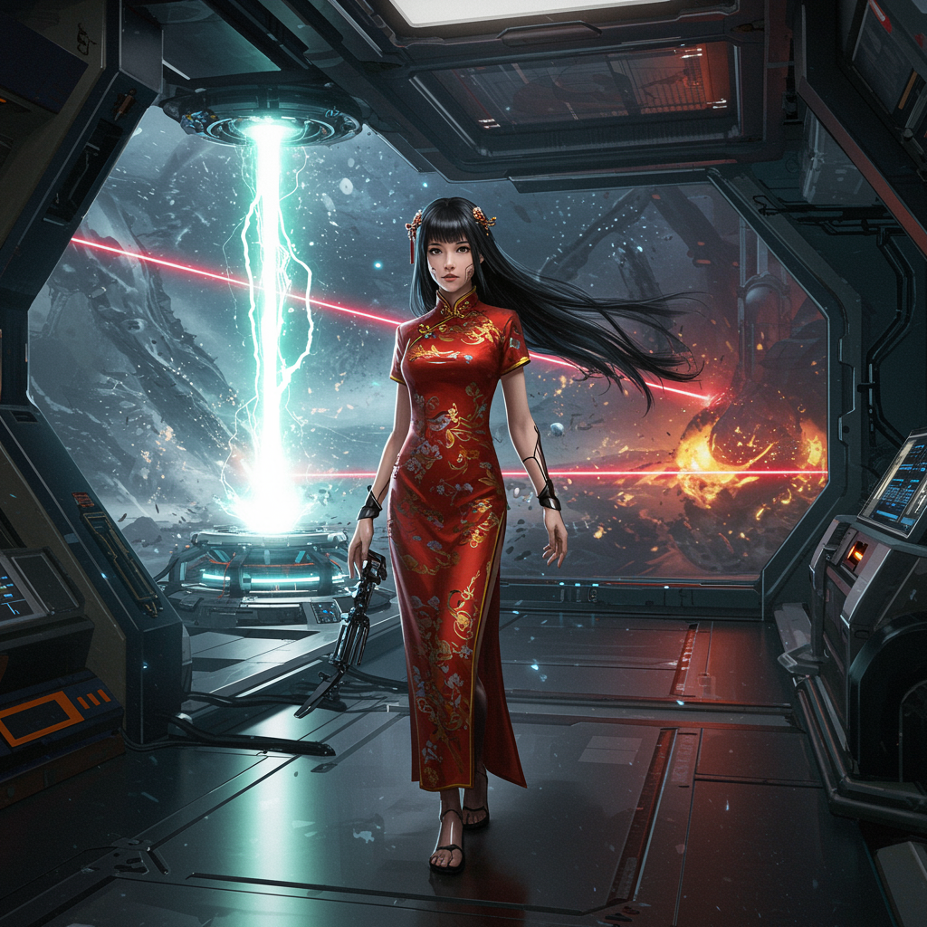 A cyber-enhanced girl with sleek cyberpunk prosthetics stands proudly in an elegant Chinese dress. Her long hair flows gracefully in a futuristic spaceship interior, embodying a sci-fi aesthetic. The scene is hyper-detailed and photorealistic, with a dazzling laser illuminating the center of the room. Outside, a powerful laser beam descends from the sky, creating energy clots that pulse with vibrant intensity. The atmosphere is infused with acceleration and speed, captured in a cinematic, long-exposure style that highlights the dynamic interaction of light and motion. The painting is rendered in breathtaking 8K HD super resolution, capturing every intricate detail with hyper realism. As she gazes forward with determination, her presence merges the traditional with the ultramodern, creating a visually arresting tableau of innovation and elegance.