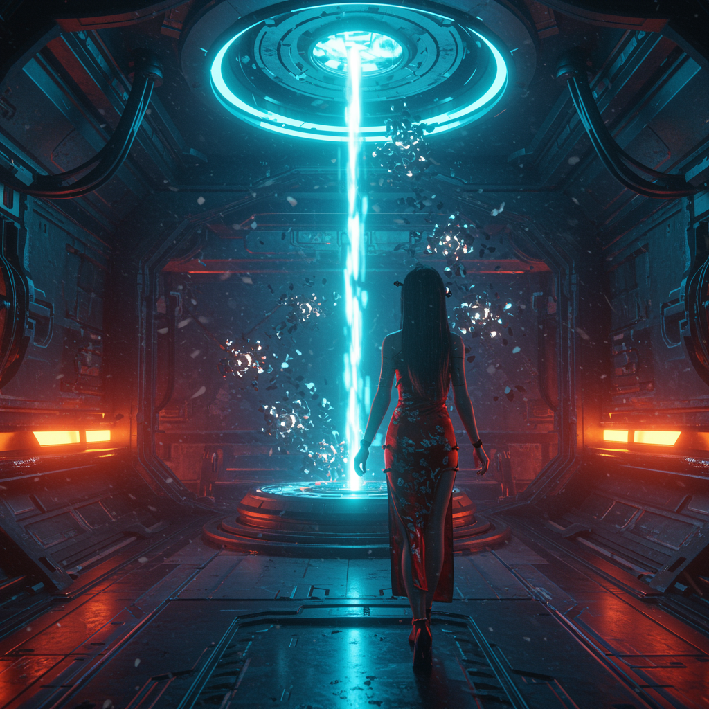 A cyber-enhanced girl with sleek cyberpunk prosthetics dons an elegant Chinese dress, her long hair cascading down as she stands inside a futuristic spaceship. The scene bathed in neon glows captures the essence of sci-fi innovation, showcasing hyper-detailed elements. A brilliant laser beam pierces the center of the room, converging from the sky with pulsating energy clusters surrounding it. The photorealistic setting emphasizes speed and acceleration, with dynamic flashes of light illuminating the space. This cinematic portrait, captured in ultra-high definition 8K resolution, conveys a sense of motion with a long exposure effect, offering a breathtaking and immersive visual narrative.