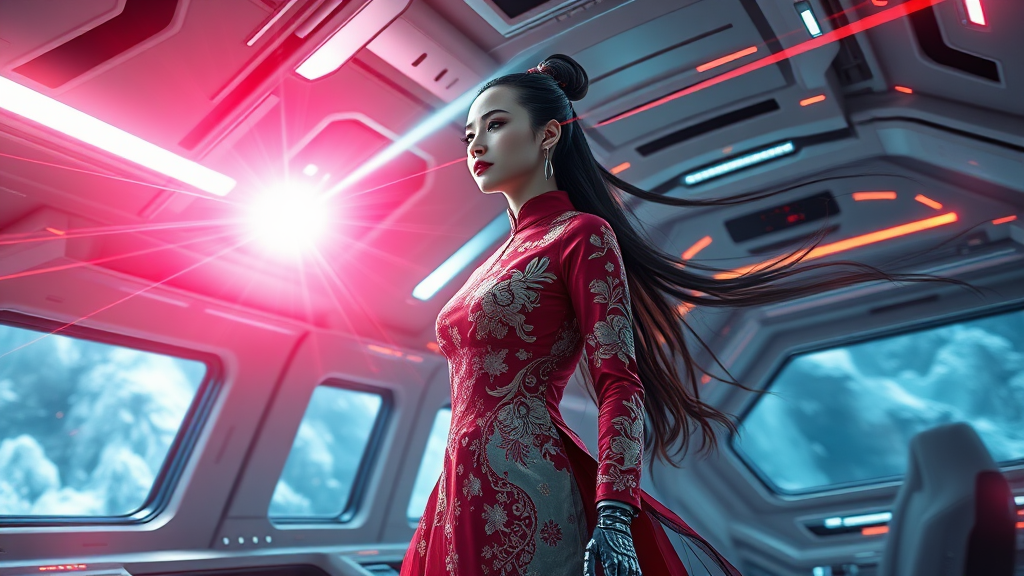A cyber-enhanced woman with advanced cyberpunk prosthetics wearing an elegant traditional Chinese dress, her long hair flowing beautifully, stands inside a sleek, futuristic spaceship. The setting is infused with a sci-fi atmosphere, hyper-detailed in photorealism and hyper-realism. A brilliant laser beams from the center of the ship, connecting with an intense laser descending from the sky. Energy pulses and clots of power fill the air as acceleration creates a sense of dynamic speed. The scene is lit with vibrant flashes of light, captured in an 8K, HD, super-resolution depiction with a cinematic feel. The long exposure illustration emphasizes the stunning intricacies and vivid colors of the composition.