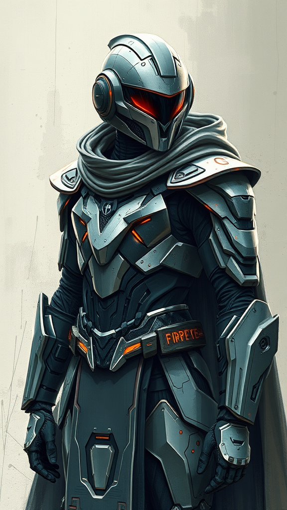 A cyber warrior clad in avant-garde armor with a sleek cape, embodying the essence of geopunk, striking contemplative stances, infused with intricate hidden elements, dynamic brushwork akin to palette knives, integrated with subtle animated elements, precise hard edge techniques, crystal-clear focus, in a highly stylized composition.