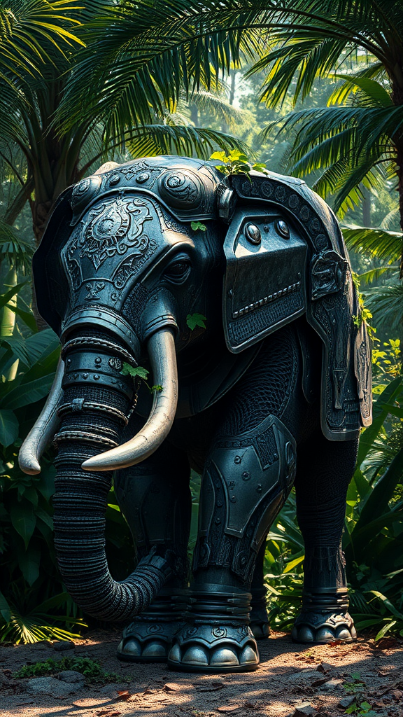 A cybernetic elephant clad in intricate battle armor stands majestically against the backdrop of a dense tropical forest, its metallic surface glistening under dappled sunlight. The chiaroscuro effect plays across its form, emphasizing the contrast between light and shadow, while sgraffito-inspired patterns grace its armor, adding depth and complexity. Vines and lush greenery intertwine with the armored plates, hinting at nature reclaiming its space amidst the futuristic warrior.