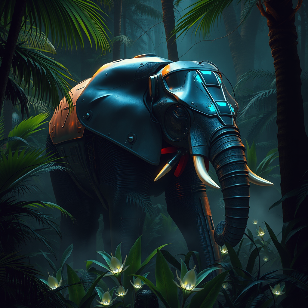 A cybernetic elephant clad in sleek battle armor emerges from the shadows, its metallic surface reflecting flickers of neon light through the dense tropical foliage. The jungle's vibrant greens and thick underbrush form a vivid contrast against the elephant's armored silhouette, creating a dynamic interplay of light and dark reminiscent of chiaroscuro sgraffito. Tendrils of mist weave around towering trees, partially obscuring the ground as bioluminescent plants cast an ethereal glow on the scene.