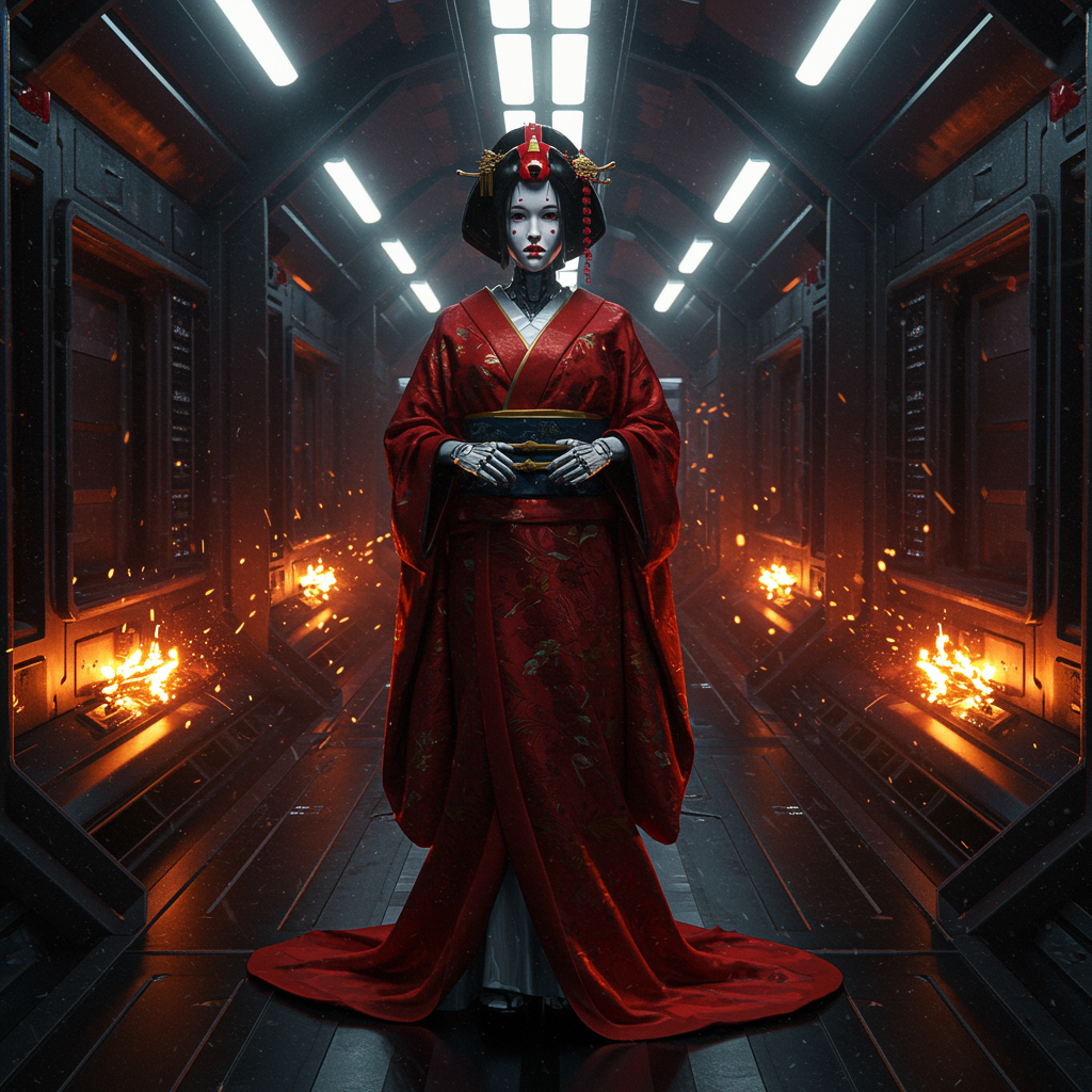 A cybernetic geisha inspired by Queen Amidala, adorned in a flowing red kimono, stands poised against the shadowy corridors of a fantastical spaceship. The scene blends the intricate style of artist Oyari Ashito with anime and manga influences. Her attire shimmers with precision detailing, as flickering lights cast dynamic, moody glows across her silhouette. The environment hums with a sense of speed and technological marvels, captured in stunning 8K UHD super resolution. Viewed from a third-person perspective, the portrait features halogen highlights that accentuate her ethereal presence, blending futuristic elegance with a touch of serene mystery.