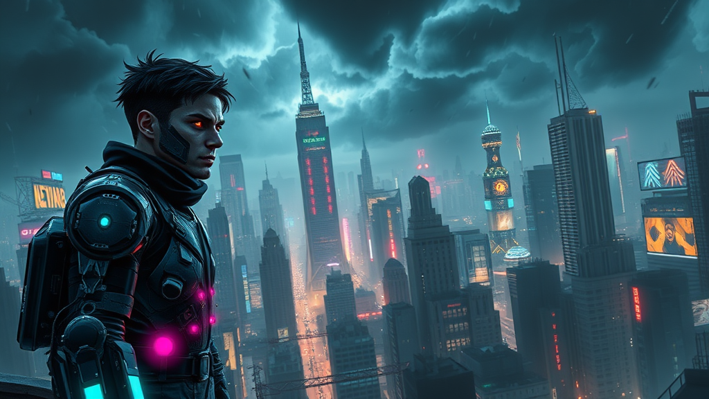 A cybernetic hero stands on the edge of a sprawling neon-lit cityscape under a stormy sky, their advanced mechanical enhancements glinting ominously in the artificial glow. Electric advertisements flicker across towering skyscrapers while shadowy figures move through the alleys below, hinting at a society on the brink of chaos. The protagonist's eyes, a blend of human determination and digital precision, survey the lurking dangers and hidden potential of this dark future world.