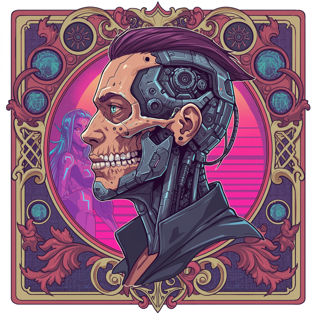 A cybernetic male figure in side profile, featuring a fusion of human and cyborg elements, with a detailed skull exposed to reveal intricate mechanical components, styled in a vibrant cyberpunk aesthetic. The scene is framed by an intricate Art Nouveau design, rich in embellishments and ornate details. The digital artwork is high definition and conceptually rich, capturing the essence of both human and machine. In the backdrop, a synthwave-inspired female figure adds balance to the composition, her form elegantly blending vibrant colors with sleek, futuristic design elements. The entire piece is a harmonious interplay of advanced technology and artistic elegance, crafted with exceptional attention to detail.