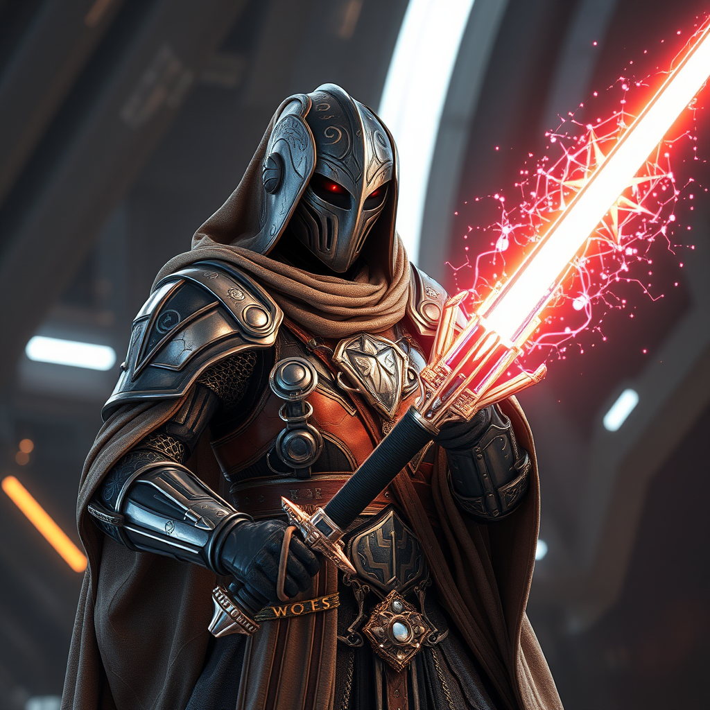A cybernetic medieval knight mage adorned in intricate, futuristic robes with shimmering patterns, wielding a radiant, ethereal weapon that glows with mystic energy, set against a sci-fi backdrop; the armor intricately blends ancient aesthetics with high-tech elements, capturing a photorealistic and cinematic style, the atmosphere charged with an aura of arcane power amidst advanced technology.