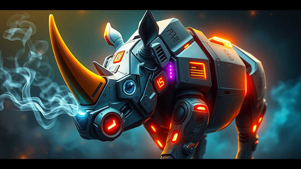 A cybernetic rhino featuring luminous eyes and a radiant golden horn, exuding a vibrant and energetic esports aesthetic, with wisps of neon-colored smoke curling from its nostrils and digital motifs etched into its surface, set against a dynamic backdrop that highlights its sleek design. The atmosphere is infused with an electric energy, emphasizing the synergy between organic strength and futuristic innovation.