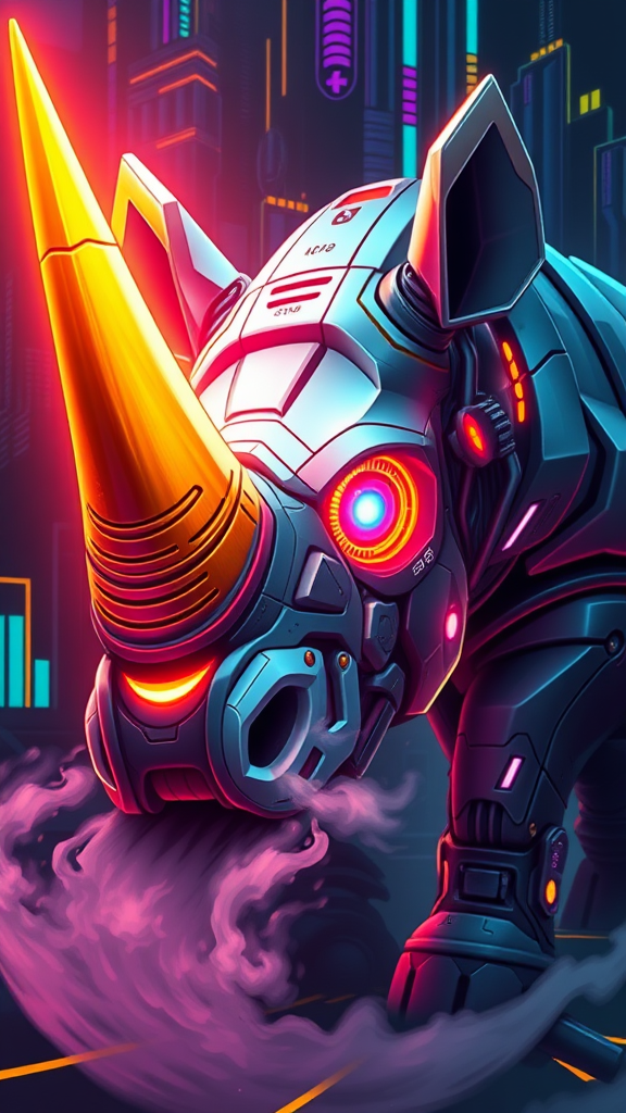 A cybernetic rhino with luminescent eyes and a bright golden horn, dynamic and esport-themed, wisps of mist emanating from its nostrils, set against a futuristic backdrop, featuring bold neon colors and intricate digital patterns, --ar 2:3 --stylize 25 --chaos 10 --q 2.