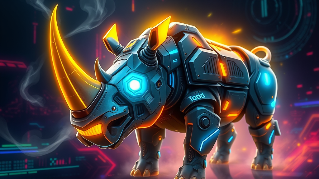 A cybernetic rhino with luminescent eyes and a radiant yellow horn, exuding an energetic esports vibe, with wisps of steam drifting from its nostrils, set against a dynamic background of electric hues and digital patterns, with the addition of sleek cyber armor and electric blue accents.