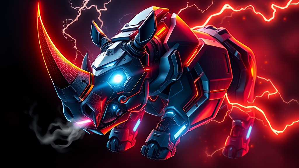 A cybernetic rhino with luminescent eyes and a radiant amber horn, electrifying and dynamic, embodying the spirit of esports, with wisps of mist swirling from its nostrils, exuding energy and intensity in a vibrant display.