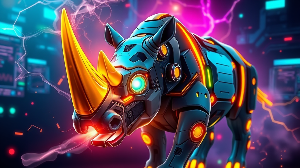 A cybernetic rhino with luminescent eyes and a radiant golden horn, designed in a vibrant, dynamic e-sport style, exhaling tendrils of neon smoke from its nostrils amidst an electrifying digital backdrop.