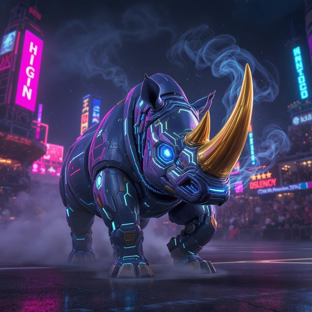 A cybernetic rhino with luminous eyes and a radiant gold horn, dynamic and esport-themed, exuding a sense of power with swirling smoke emerging from its nostrils, set against a neon-lit cityscape backdrop, capturing the vibrant energy of a digital arena.