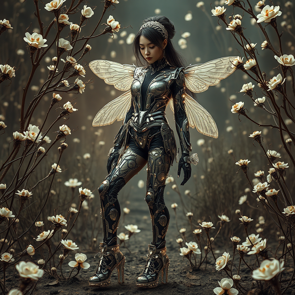 A cybernetic surrealism scene featuring a woman adorned in a reflective chrome vest, seamlessly integrated into her costume, with intricate shoes. Her form is rendered with hyper-realistic precision, composed of interwoven insects that shimmer in hues of dark white and light black. The ambiance exudes a womancore essence, enriched by the eclectic fusion of flowerpunk aesthetics. The environment amplifies a raw, futuristic complexity, blending mechanical elements with nature's unpredictable beauty. The art is an evocative interplay of contrasts, where technology and organic life converge into a mesmerizing spectacle.