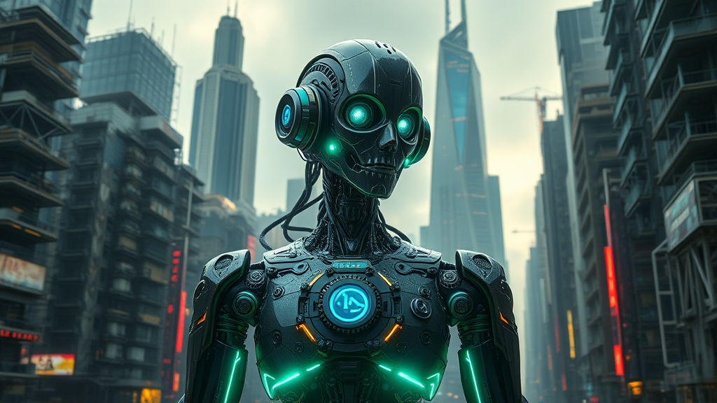 A cyberpunk android stands amidst a futuristic, dystopian cityscape, pondering the looming apocalypse. Its steampunk-infused design glistens with intricate gears and glowing neon circuits, reminiscent of a high-end videogame asset. The scene is captured with a cinematic focus, rendered in stunning octane quality, evoking a rich depth and immersive atmosphere. The composition follows the golden ratio, creating a visually harmonious balance. The wide-angle lens accentuates the sprawling urban decay surrounding the android, blending the chaos of crumbling skyscrapers with the serene contemplation of the machine's expression.