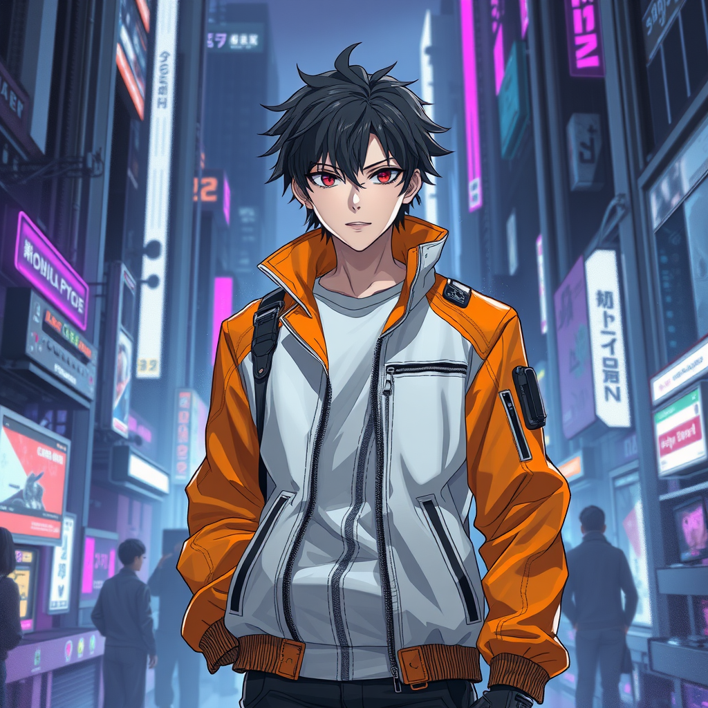 A cyberpunk anime character wearing a sleek white and vibrant orange jacket stands amidst a futuristic cityscape, illuminated by dark white and soft violet neon lights. The scene features precise brushwork and intricate automatism, creating an image that blends the character seamlessly into their high-tech environment. Official art style with lucid development highlights the character's expressive design and technological embellishments. Attention to detail showcases the character’s intense gaze and advanced gear, enhancing the narrative's depth and visual richness.