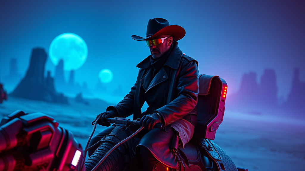 A cyberpunk cowboy donning a leather trench coat and neon-accented cowboy hat, navigating a rugged tauntaun across a vibrant, bioluminescent alien landscape, captured with a 50mm lens for a sharp, photorealistic depth. The scene is immersed in cinematic lighting with atmospheric blue and purple hues casting dynamic shadows, highlighting the interplay of the cowboy’s reflective visor with the soft, otherworldly glow of distant floating rock formations --ar 3:4 --v 5.1.