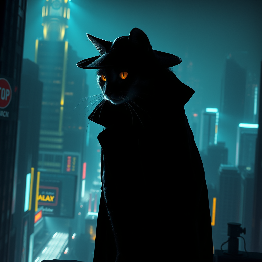 A cyberpunk detective cat, silhouetted against a sprawling neon-lit cityscape, exuding an aura of ATMOSPHERIC GOTHIC HORROR. The creature stands in full growth amidst the shadows, embodying Lovecraftian terror. The scene boasts hyper-realism, created using unreal engine with exquisite ray tracing, capturing hyper details in its fur and the texture of its overcoat. It's enveloped in an environment with very dark lighting, heavy shadows, and rich, intricate detailing, reminiscent of digital art and realistic painting styles. The artwork embraces a wide-angle perspective, trending on artstation for its unique blend of soft natural lighting with dramatic, cinematic effects. The setting is infused with a sense of magic photography and photorealism, achieving excessive detailing and intricate conceptualization. Volumetric and cinematic lighting lends an ethereal glow, spotlighting the cat's piercing, almost otherworldly gaze as it navigates this dystopian realm.