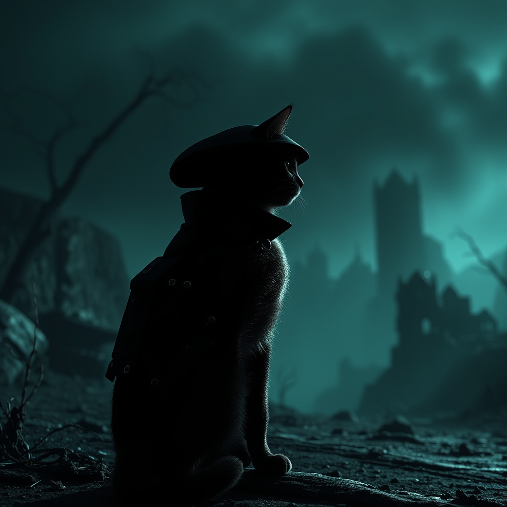 A cyberpunk detective cat stands in the distance, its full body silhouetted against an atmospheric gothic horror backdrop. The scene is infused with Lovecraftian dread, blending elements of horror and sci-fi. The landscape is bathed in very dark lighting with heavy shadows, each detail captured with intricate, hyper-detailed precision. The wide-angle view highlights the cat's sleek, futuristic attire, illuminated by soft natural and dramatic lighting, creating a photorealistic effect akin to portrait photography. The setting features raytracing technology, with cinematic and volumetric lighting casting an otherworldly glow, reminiscent of magic photography. Excessive detailing brings this digital art to life, trending on ArtStation for its smooth concept art and hyper-realistic execution.