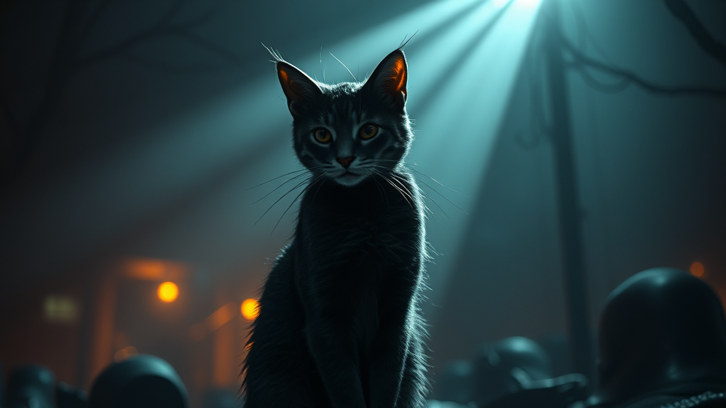 A cyberpunk detective cat stands in the distance, its full body enveloped in atmospheric gothic horror, with a Lovecraftian twist. The scene is rendered in a Midjourney style, utilizing the power of Unreal Engine for hyper-realistic detailing. Ray tracing casts intricate patterns of light and shadow, creating very dark lighting with heavy shadows. The cat, a figure of unreal complexity, is captured from a wide-angle view, blending digital art with realistic painting techniques. Influences of DnD are evident, as the concept trends on ArtStation. Bathed in soft, natural lighting with elements of portrait photography, this magical portrait is illuminated by dramatic, cinematic lights, achieving a level of photorealism that excels in excessive detailing. Smooth lines and hyper details are empowered by volumetric lighting, crafting a hauntingly beautiful scene that resonates with the echoes of a gothic future.