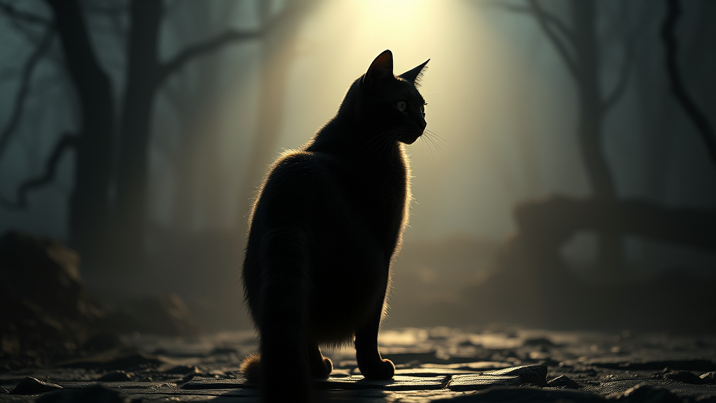 A cyberpunk detective cat stands in the distance, its full body outlined against an atmospheric gothic horror backdrop. The scene, inspired by Lovecraftian elements, is crafted with unreal engine precision and features rich ray tracing. The setting is enveloped in very dark lighting, with heavy shadows casting an eerie mood. The cat's highly detailed form is captured in a wide-angle perspective, resembling digital art with a realistic painting aesthetic. Reminiscent of DnD, the tableau is trending on ArtStation, showcasing soft natural lighting that contrasts with the dramatic, cinematic elements. This magic photography scene exhibits photorealism, emphasizing excessive detailing and intricate features. The cinematic lights, combined with volumetric rays, create a smooth, hyper-detailed image, perfect for concept art exploration.