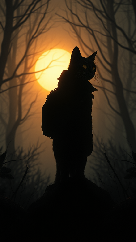 A cyberpunk detective cat stands in the distance, silhouetted in full growth amidst atmospheric gothic horror. The scene, captured in a Midjourney style, evokes Lovecraftian horror with unreal engine sophistication. Hyper details emerge through very dark lighting and heavy shadows, revealing a wide angle view in digital art form. The realistic painting integrates DnD influences, trending on Artstation, combining soft natural lighting with dramatic flair. Magic photography elements seep through, creating photorealism in excessive detail. Intricately designed, the artwork displays smoothness and cinematic lights enhanced by ray tracing and volumetric lighting, presenting a concept art masterpiece in hyper detail.