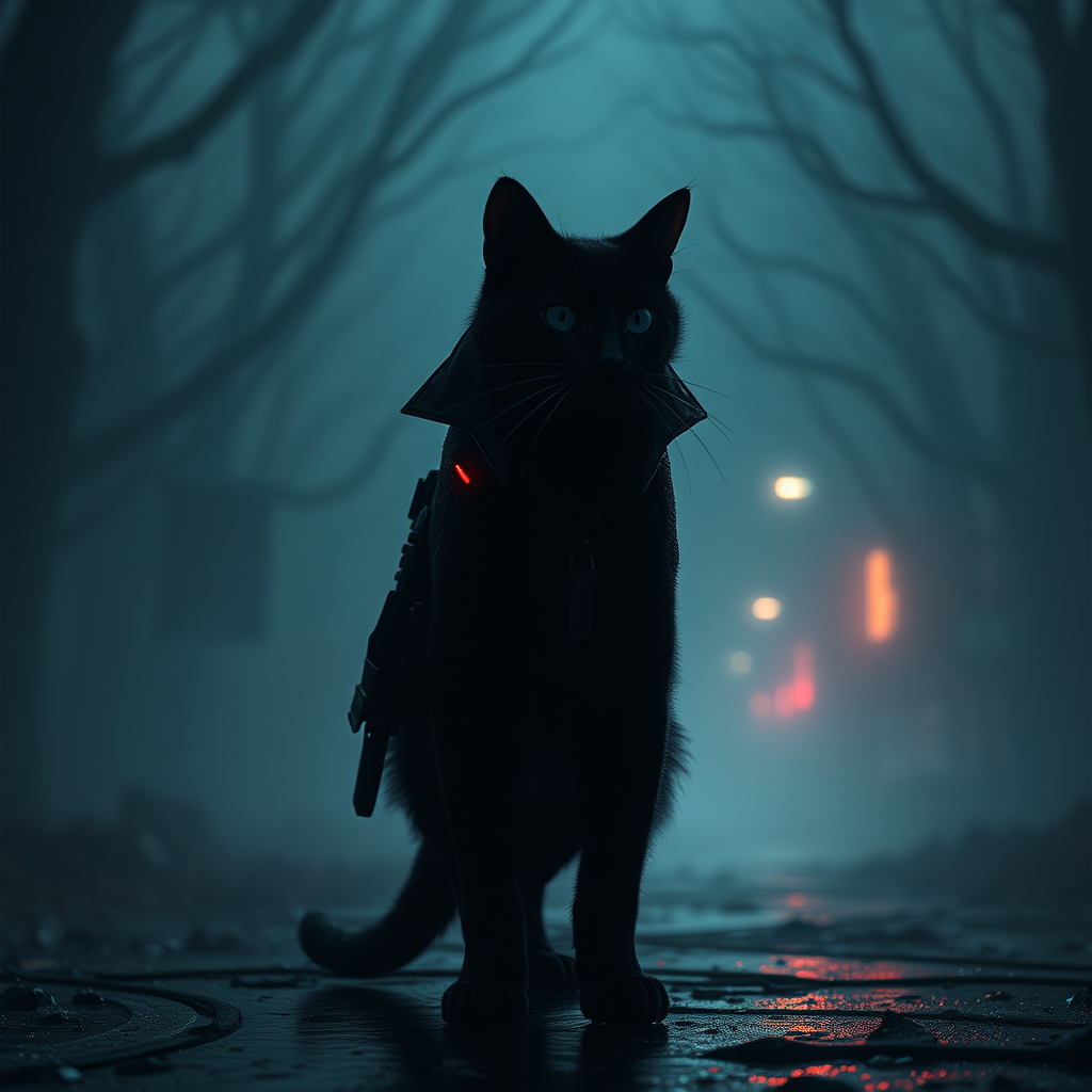 A cyberpunk detective cat stands in the eerie distance, bathed in atmospheric gothic horror. Its full body silhouette outlined against a backdrop reminiscent of a Lovecraftian nightmare. The scene is wrought with hyper-realistic, intricate details, achieved through the power of Unreal Engine and ray tracing technology. Dark lighting and heavy shadows cast an ominous ambiance, amplifying the sense of mystery. The composition uses a wide-angle view, encapsulating the cat's sleek, futuristic attire. The artwork embodies a blend of digital art and realistic painting, seamlessly merging DnD-inspired fantasy with modern trends on Artstation. Soft natural lighting juxtaposed with dramatic cinematic lights creates a magic photography effect. Every detail is hyper-realistic, from the texture of the fur to the gleam of neon reflections. Volumetric lighting weaves through the scene, enhancing the gothic horror atmosphere. This concept art piece captures the essence of photorealism with excessive detailing, immersing viewers in a world where fantasy and technology intersect.