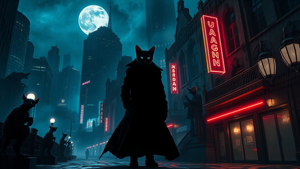 A cyberpunk detective cat stands in the shadows of a sprawling, neon-lit cityscape, silhouetted against the swirling mist of a moonless night. The distant figure is cloaked in a long, flowing trench coat that flutters ominously in the breeze. Its eyes, glowing an ethereal blue, pierce through the atmospheric gothic horror that envelops everything around. The city is a sprawling labyrinth of towering skyscrapers and ancient stone structures, their surfaces slick with rain and illuminated by flickering signs casting eerie reflections. In this Lovecraftian setting, twisted gargoyles peer down from the ledges, their chiseled features eerily lifelike under the neon glow. The air is thick with a sense of foreboding as hyper-realistic shadows cascade over the cobblestone streets below, enhanced by the unreal engine's sophisticated ray tracing technology. This creates a play of dramatic light and darkness, accentuating the intricate details of the cat's fur and the baroque architecture surrounding it. The scene is masterfully crafted, with volumetric lighting casting a warm yet ominous glow, adding depth to the heavy shadows. The overall composition paints a surreal and hauntingly beautiful picture, combining elements of concept art and photorealism, making it a captivating spectacle that could be straight out of a magical, cinematic universe trending on ArtStation.