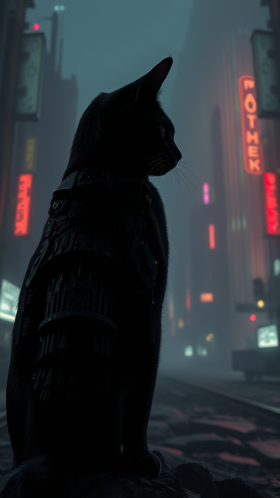 A cyberpunk detective cat stands ominously in the distance, fully revealed in its enigmatic posture, embodying atmospheric gothic horror. Its sleek fur glistens under the hyper-detailed, ray-traced lighting, casting heavy shadows that dance in the dark, brooding environment. The scene, reminiscent of Lovecraftian nightmares, is illustrated with unreal engine precision. A wide-angle perspective captures the vastness and eerie silence of the dystopian landscape. The setting is rich with intricate details, from the subtle circuitry etched into the cat's augmented body to the quietly whirring neon remnants of a forgotten metropolis. With artful touches of dramatic and volumetric lighting, the scene suggests a mysterious magic hovering just beneath the surface. Inspired by DnD aesthetics and trending on Artstation, this digital masterpiece blurs the line between realistic painting and cinematic photography, producing an immersive experience with smooth textures and excessive detailing that commands attention.