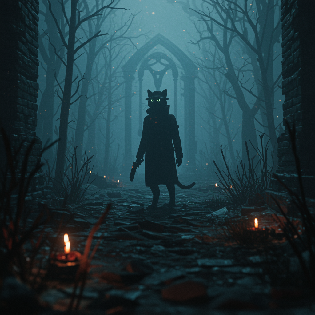 A cyberpunk detective cat stands tall in the distance, its silhouette framed by an atmospheric gothic horror landscape. The scene evokes a Lovecraftian nightmare, blending horror with unreal engine hyper-realism, brought to life with advanced ray tracing and hyper details. Shrouded in very dark lighting and heavy shadows, the cat's form is both intricate and enigmatic, captured in a wide-angle view reminiscent of digital art that insists on meticulous detail. Soft natural lighting mingles with dramatic, cinematic lights to craft a photorealistic masterpiece, reminiscent of trending ArtStation and concept art. This magical photography captures the essence of DnD with its excessive detailing and intricate design, enveloped in smooth textures and volumetric lighting, offering a modern yet timeless portrait of mystery and intrigue.