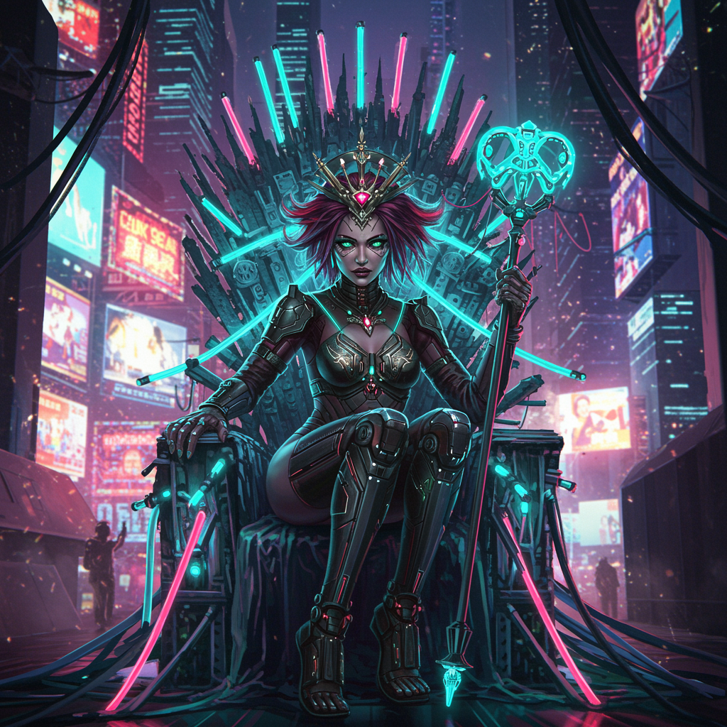A cyberpunk empress perches on a throne woven from vibrant neon tubes, encircled by colossal skyscrapers and pulsating holographic ads. Her intense green eyes are accented by intricate cybernetic augmentations, and her hair, a kaleidoscope of shifting hues, dances with the neon glow. She dons a sleek, dark, form-fitting ensemble enhanced with shimmering metal and intricate circuitry, while a radiant scepter resides in her grasp. Her dominion in this realm of advanced technology and dazzling lights is unrivaled, commanding both awe and trepidation among those who encounter her.