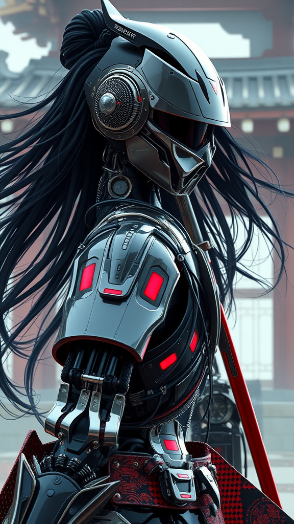 A cyberpunk female robot samurai with a sleek, mirrored face shield and hyperdetailed helmet; her flowing black hair cascades over reflective black and neon red armor. Her robotic joints are crafted from intricate metals, interwoven with cables and wires. A gleaming katana is elegantly strapped to her back, poised for action. The abstract background evokes the serenity and mystique of an eastern temple, blending technology with traditional elements.