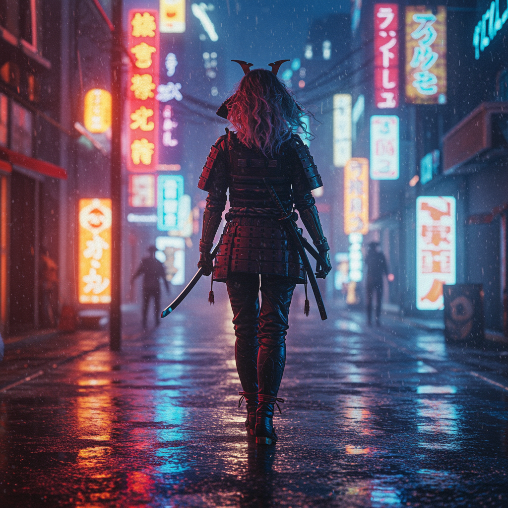 A cyberpunk female samurai strides purposefully through the bustling streets of downtown Tokyo, her long wavy hair flowing behind her. The vibrant neon lights cast vivid reflections on the wet pavement, creating a cinematic atmosphere amidst the rain-soaked scene. She moves with a determined grace, her attire intricately detailed, reminiscent of a Frank Frazetta painting. The setting is a stunning 8k high-quality capture, with ultra-sharp focus highlighting the intricate designs of her armor. The atmosphere is alive with vibrant colors and intricate details, embodying the essence of a futuristic urban landscape.