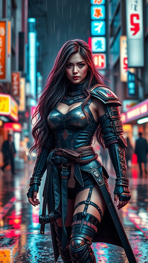 A cyberpunk female samurai strolls through downtown Tokyo, her long, wavy hair flowing in the neon-lit atmosphere. The streets glisten with rain, capturing cinematic reflections of vibrant lights. She embodies the essence of a futuristic warrior, combining traditional elegance with modern technology. Her attire is detailed and intricate, with armor that seamlessly integrates advanced tech. The scene is incredibly sharp and vivid, displaying the bustling city in 8k resolution. Each drop of rain is visible, enhancing the immersive quality of the setting. The overall composition resonates with Frank Franzetta's style, capturing a blend of classic and contemporary elements, resulting in an artistic masterpiece devoid of any imperfections or distractions.