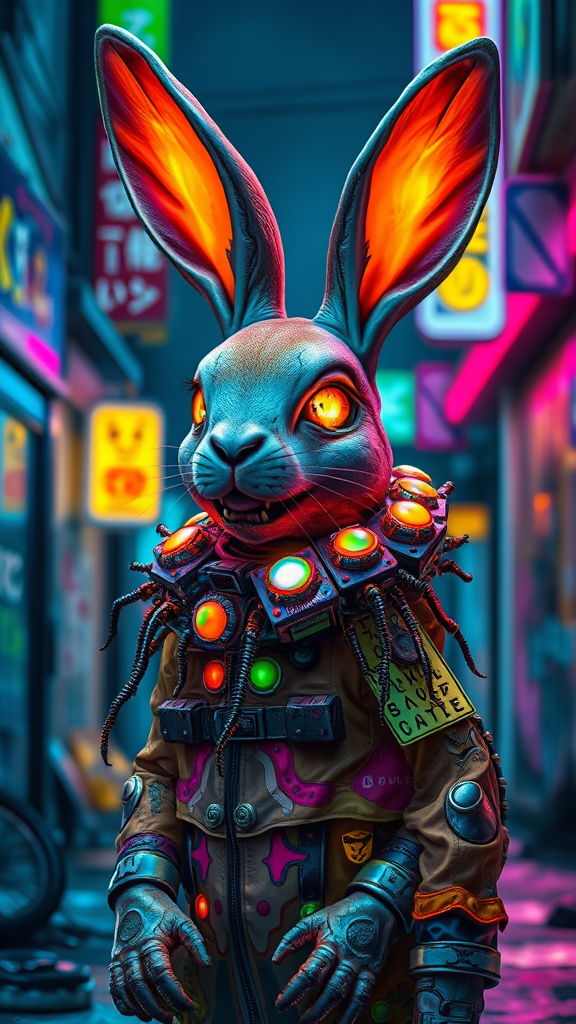 A cyberpunk futurism-inspired zombie bunny adorned with a luminescent, multicolored collar, its form an intricate assembly of crawling insects, exudes a playful yet subtly dark aura. Embodying a contrast of colorful costumes and vibrant, graffiti-esque patterns, it stands against a neon-drenched urban backdrop. The creature's eyes flicker with a peculiar, honeycore warmth, adding an unsettling charm to its lithe and lit demeanor, capturing the essence of a street-smart, lit kid in this surreal landscape.