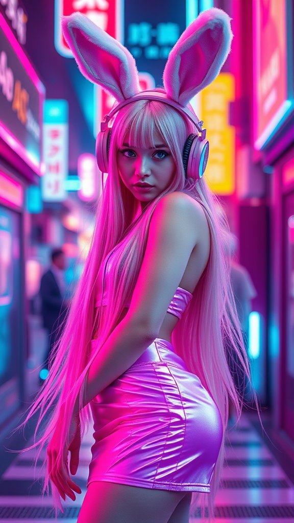 A cyberpunk girl embodying the spirit of a pink Santa Claus stands in the vibrant cyber world, her long, lustrous hair flowing beneath pink bunny ears and oversized pink headphones. She wears a sleek, iridescent pink skirt that catches the glow of surrounding neon lights, casting an aura of technological enchantment. Her eyes, reflecting the digital paradise, reveal a mischievous glint of futuristic curiosity. Shot with a Phase One XT IQ4 150MP using low exposure and high contrast settings at ISO 50, this scene is captured through an 80mm prime lens, highlighting intricate details amidst the dynamic chiaroscuro of light and shadow.