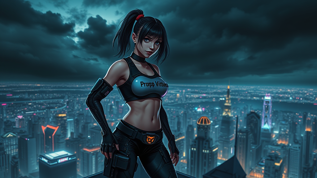 A cyberpunk girl with "Prompt Virtuoso" emblazoned on her chest stands boldly on a rooftop overlooking a sprawling dystopian cityscape. Her dynamic pose exudes confidence and fierceness, framed by an ominous, dark stormy night sky. The city below flickers with the eerie glow of neon lights and holograms, casting a kaleidoscope of colors on her intricate and detailed cybernetic suit. The dramatic and moody lighting enhances her silhouette against the chaotic backdrop. Captured in the hyper-realistic style of a graphic novel, the scene is rendered with the precision and depth of a long-exposure photograph, reminiscent of a high-resolution Hasselblad shot.