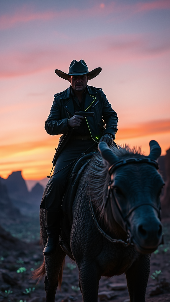 A cyberpunk gunslinger in a sleek leather duster, neon accents glowing against the twilight, wearing a wide-brimmed cowboy hat. The rider leans confidently atop a tauntaun-like creature, its scales shimmering under otherworldly skies. The alien landscape sprawls beneath, jagged cliffs and bioluminescent flora casting intricate shadows in the cinematic light. Photorealistic detail captures the fusion of frontier grit and futuristic allure, with a 50mm perspective enhancing the sense of intimacy and drama.