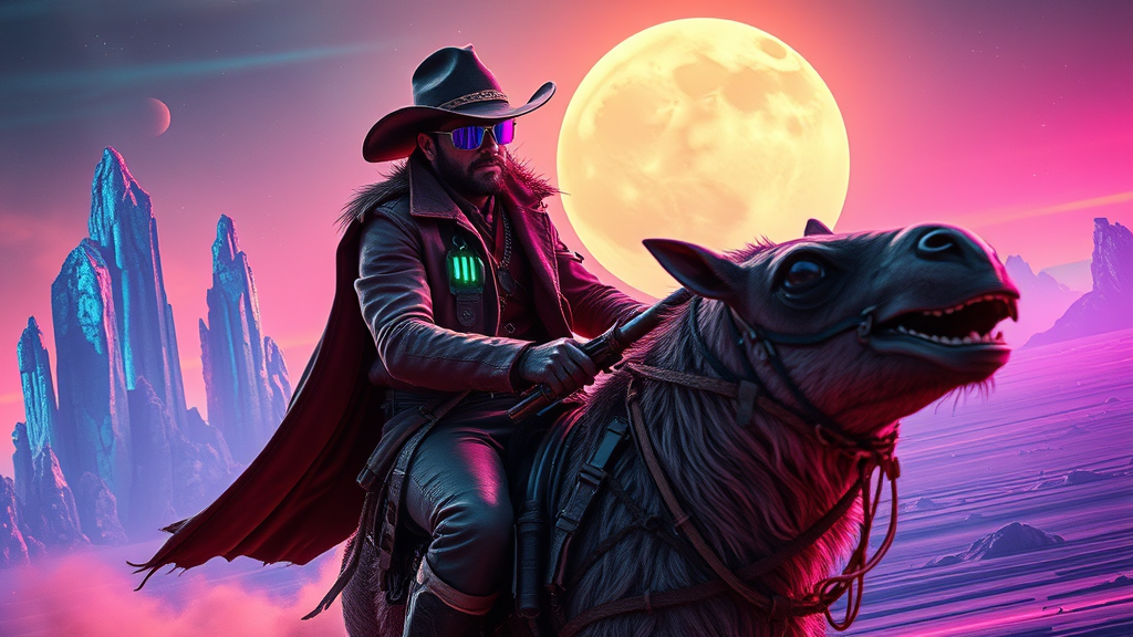 A cyberpunk gunslinger in a weathered leather duster and sleek cowboy hat, outfitted with neon-accented gear, rides a bionic tauntaun across an iridescent alien terrain. The sky shimmers with electric hues, casting a cinematic glow over towering crystalline formations. Dust swirls around as the steely-eyed cowboy surveys the horizon through shaded lenses, illuminated by glowing data feeds from a futuristic HUD. The air is dense with ambient sounds and distant cosmic echoes as the landscape reflects metallic textures under the vibrant neon lighting, creating a photorealistic scene through the 50mm lens.