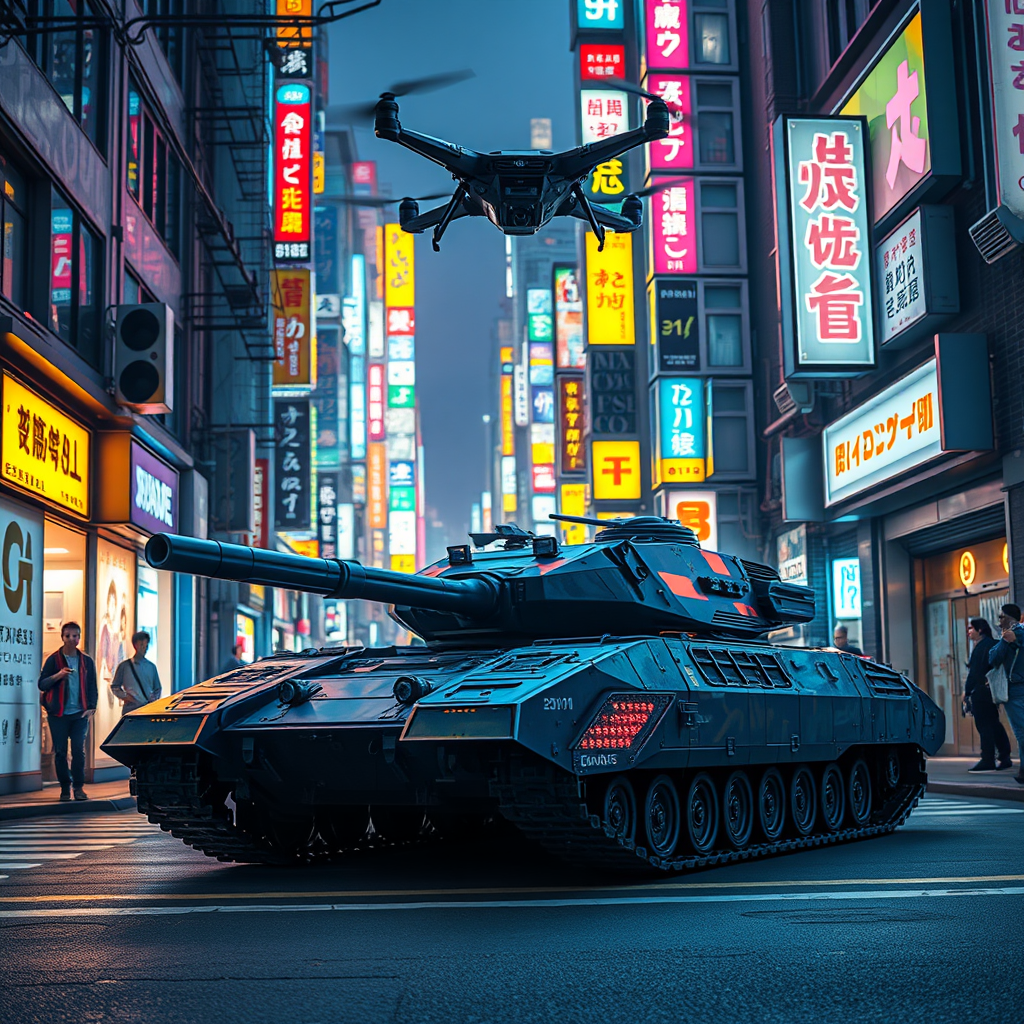 A cyberpunk-inspired, advanced military tank navigating through the narrow alleys of a neon-lit Japanese city, its sleek, armored exterior reflecting the vibrant glow of colorful holographic advertisements, while futuristic drones hover above, casting dynamic shadows on the bustling urban landscape.