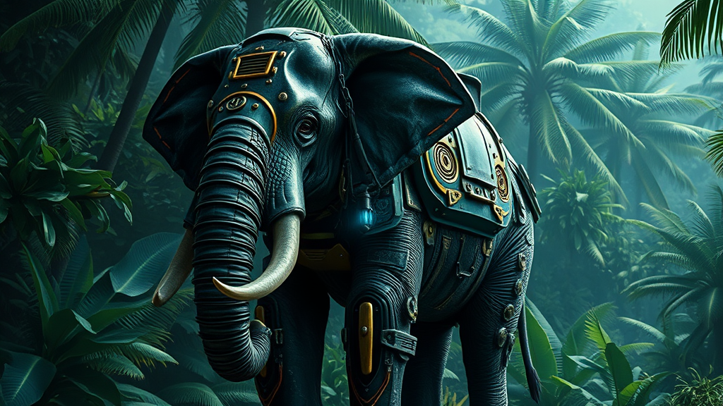 A cyberpunk-inspired armored elephant, its battle gear gleaming with neon accents, stands majestically against a lush tropical forest backdrop. The scene is illuminated with dramatic chiaroscuro, capturing the play of light and shadow, while the textures of sgraffito detail add layers of complexity, emphasizing the intricate patterns on the elephant's armor and the dense foliage surrounding it.