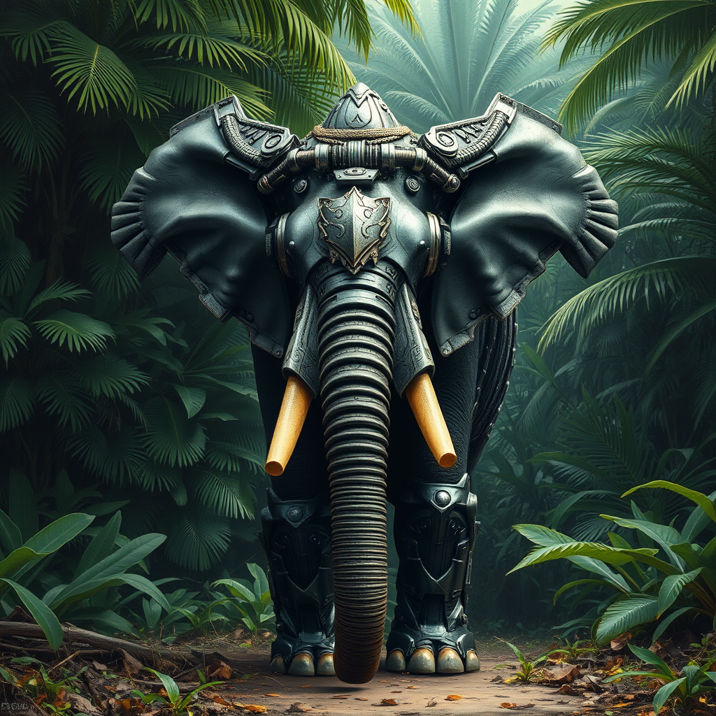 A cyberpunk-inspired elephant clad in intricate battle armor stands imposingly against a lush, dense tropical forest backdrop. The scene is rich in dramatic contrasts, highlighting the metallic sheen of its armor against the verdant greens of the foliage, crafted in a chiaroscuro sgraffito style, with subtle futuristic elements weaving through the natural setting.